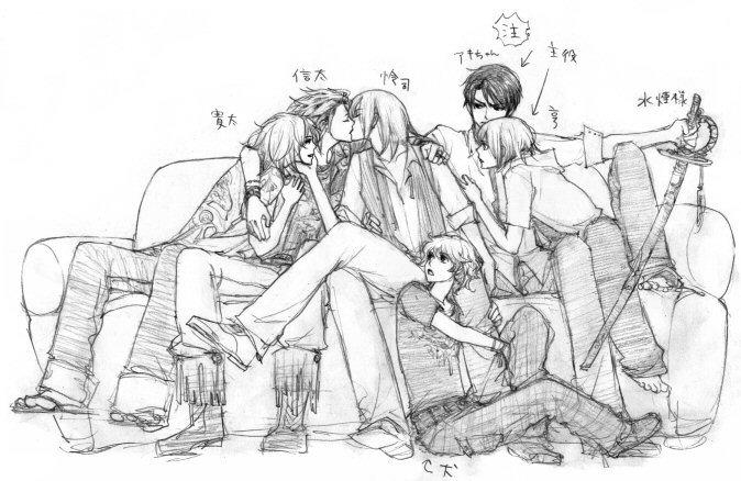 サムネイルは三人だけですが、絵にはもっと沢山描かれています。ほぼオールスターみたいになってます。豪華だな! しかも、神戸編の人間関係が的確に表現されております。人間なのアキちゃんだけですが。中でも、なんで信太と怜司がキスしてんのか謎なのに、すごく納得感もあり。思わずそこをサムネイルにしちゃいました。こう言うとカドが立ちそうですが、たぶん信太はとっても怜司が好きだったんです。しかし振り向いてくれない人っています。自分ではない誰かを一途に想ってる人がステキに見える時ってあります。それってちょっと少年の日の恋みたいなもんです。そんなトシじゃないくせに。永遠の少年な信太兄さんでした。寛太がけっこう平気そうなのは、そんなアホな兄貴の気持ちを実はよく理解してくれてるからのよーな気がしますが、ただアホなだけかもしれません……。そのほか、ものすご羨ましそうな亨ちゃんと犬とか、すごくイラッとしてるっぽいアキちゃんとかが、この絵の見所です。アキちゃん……なにを、イラッとしてんのや……? -