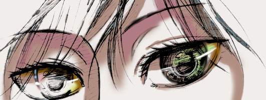 お目々描くのって楽しいですよね。亨の目は、普段は色薄いめの茶色で、ときどき金色の猫目になっています。設定的には、吸血したくなると金色になってくるみたいです。変身しそうなときにも、目の色変わってるようです。そっちが本性で、普段の姿は「イイ子風」と、亨が信じている姿なんだと思います。本人は普通のつもりだけど、たぶん全然普通ではないです。自分のこと色々誤解している人ですね。 -