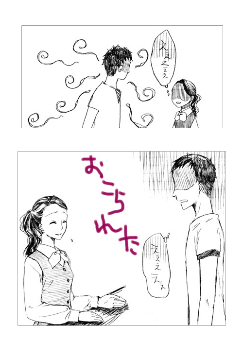 名前もないキャラなのに、絵に描いてもらえちゃった。私もこの人なんとなく好きです。気になってしょうがないです。でも、ほんとにちょい役なので、名前をつけていません。霊感のある人みたいです。何が仕事に役立つかわからないという見本のような人です。たぶん通勤バスで帰宅しながら「ロビーで日本刀振り回してる人見ちゃった」とかモヤモヤしたんでしょうね。でも霊感で見たヤツだし、言うかどうかで一晩悩んで、結局言っちゃったんだね。説教してやってください、ジュニア悪い子なんで。 -