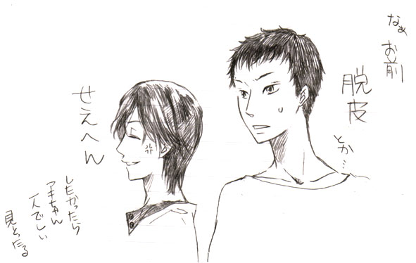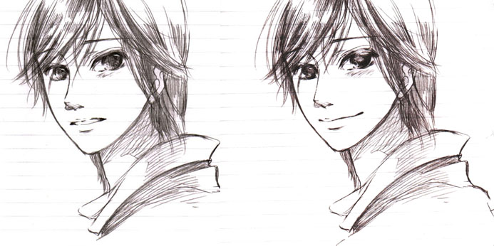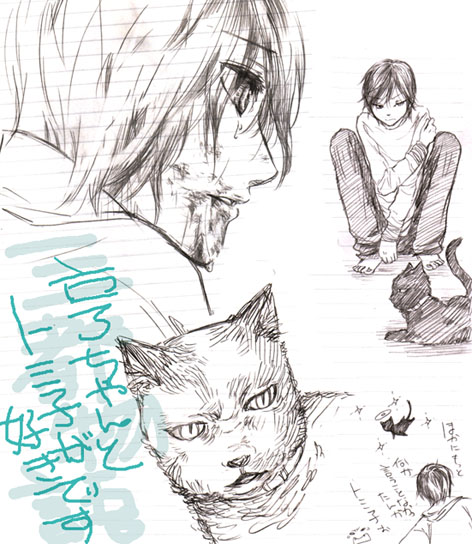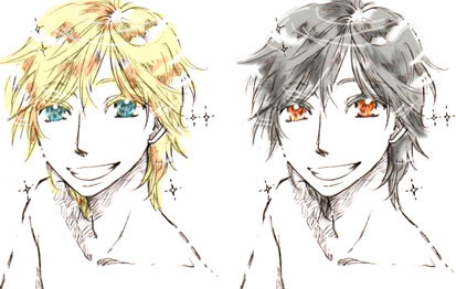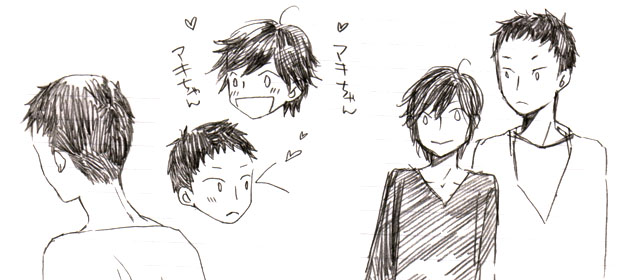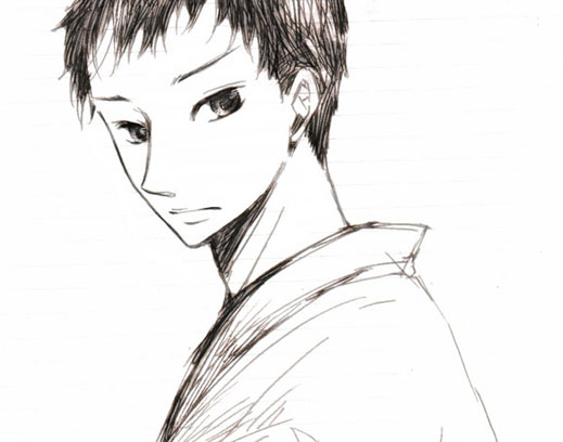 亨は髪の毛の色薄いという設定なんですが、作者がそれにちょっと後悔してくる絵。アキちゃん和物スキーやから、だんだん黒髪シフトしてくるとかどうでしょう。(真剣に検討する作者) 髪の毛ちょっと長めはイメージ同じかも。ふわふわ、さらさら、寝癖でぐちゃぐちゃです。関係ないけど、この罫線が、昔、友達が学校で描いてくれた絵みたいで懐かしいです。 -