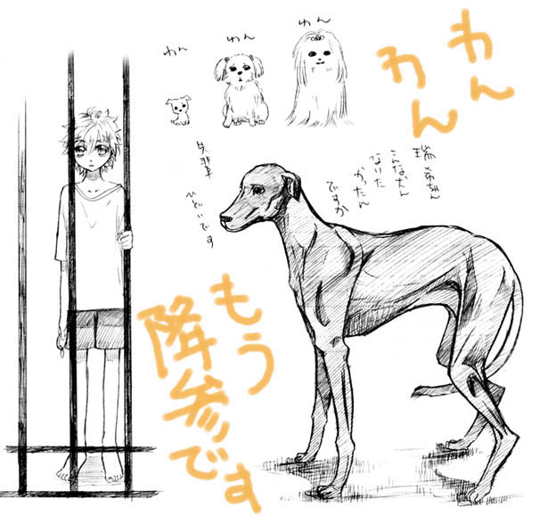 サムネイルは絵のごく一部です。マルチーズ可愛すぎたのでクローズアップしてしまいました。ちびっこい瑞希ちゃん(人型)の絵もあるので、必ずクリックして開いてみてくださいね!! 作者の脳内イメージでは、犬時代の瑞希ちゃんは、毛の短いほうのマルチーズです。たぶん可愛い飾りとか付けられてました。服とかも着てました。ひょっとすると犬香水とかマニキュアとかされてた恐れもあります。瑞希ちゃんはそれに、「俺、犬やのに!」と引いてたみたいです。どんなに野生に目覚めても、見た目可愛いのでしょうがないです。愛玩犬なんですから。そんな自分に嫌気がさして、猟犬みたいになったのかもしれないですが、これはたぶん地獄ネタなんです。ヘルハウンドなんです。出会った者に死をもたらす不吉な黒い犬のことです。案外マニアックだね。 -