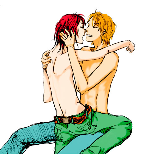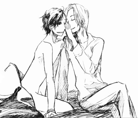 亨ちゃんに耳打ちしている怜司。この時、いったいどんな話してたのか、作者も知りません。これもきっと想像を絶したようなエロ話なんでしょうけど、それっぽっちで、水地亨のハートを掴んだみたいです。しょせんエロエロ妖怪どうしです。同じ穴の狢ですから。とはいえ亨ちゃんは怜司兄さんに全裸見られて、恥ずかしくなかったんでしょうか。そのへん作者の書き忘れなのか。私も書いてて、その件ちっとも思い当たりませんでした。水地亨は裸でいいのよ。 -
