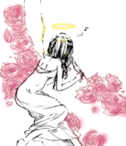 昔の少女まんがの基本言うたら、背景にお花でした。今のはどんなんか知らん作者です。まんが描いてた友達の原稿手伝って、背景に花描いたりしてました。トミ子、たぶん少女まんが絵描けるんです。お目々キラッキラのやつ。髪の毛サラッサラとか、くるくる縦ロールのとか。実はそんなん好きやったんです。密かにね。それが天使時代の黒髪縦ロールに現れている。あっ、あれはトミ子やのうて聖スザンナか。間違えました。すみませんでした。 -