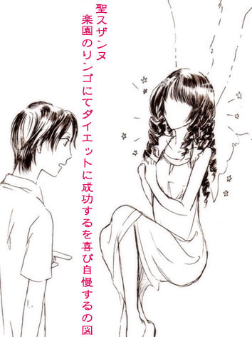 女の子って、ダイエットの話するの大好きですよね。林檎ダイエットとか、低インシュリンダイエットとか、昔も今もいろいろ流行ります。トミ子やのうて聖スザンナも、あの世では幸せにやっているようです。足痩せ成功しちゃったりなんかして。でも顔はブサイクのままやから。絵にも描けない醜さなんです。その具体的な顔の造作とか、作者は想像したことありません。想像を絶した醜さなんです。舞ちゃんに続いて、のっぺらぼうの女の子が出てくるのがお約束なのかな、この話。 -