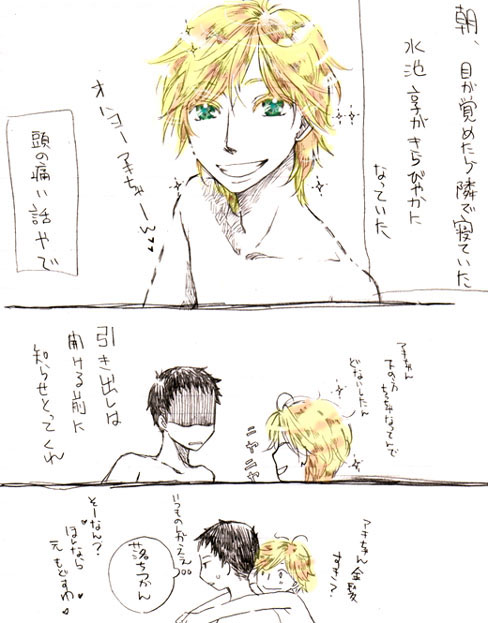 SantoStoryが漫画に!!!(まずそこから強調) というか、水地亨がガイジンに! 明日の朝には一体、何になっているのでしょうか。アキちゃん毎朝目覚めて、全身ビクッてなってそうです。怖くて起きられなくなります。でも、アキちゃん金髪は嫌いじゃないみたいです。神戸編に金髪の人出てきます。しかし水地亨の金髪バージョンには引いてそうです。とにかく初期版がいいらしいです。 -