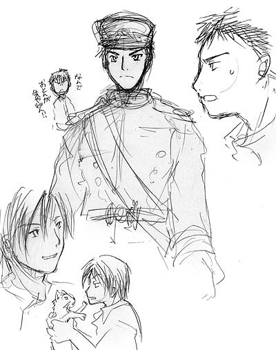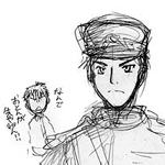 このトリミングだとアキちゃん(実在)のほうが、おとん(幽霊)の背後霊みたいです……! 他にもトミ子と亨ちゃんとか描いてもらっているのですが、軍服おとんが萌えすぎだったので、つい、こうなりました。軍服のおとんが出てくるような話を書きたいのですが、時代考証などの知識不足で書けません!! 萌えだけでは無理でした(ガクリ) しょうがないのでアキちゃんで我慢しようかなと思います。しかし、軍服コスのアキちゃんにはあんまり萌えへんのに、おとんだと萌えるのは何故でしょう。作者のココロの神秘です。 -