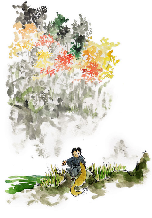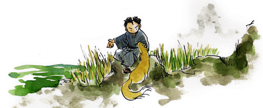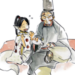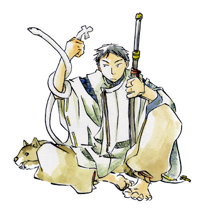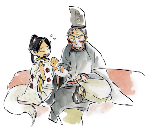 茂ちゃんが小さかった時の秋尾さん。秋尾さんは主神のダーキニー様のところでは、主に平安るっくな稚児姿だったのではないかと思います。でも、他にもいろんなモンに化けられたので、小さい茂ちゃんを抱っこしたりおんぶしたりしないといけない場合は、人間の大人の姿に化けていたんじゃないかと。遊び友達が必要なときは、子供に化けたりもしていたのかなと思います。秋尾は茂ちゃんから見て、同い年くらいの時と、年上のときと、後々には、自分より若いときがあり、なんだか不思議です。女の子のときもあるんだから、性別も超越してるっぽいです。いつも変わらないのは、秋尾さんが茂ちゃんの使役を受ける式神であり、同時に保護者でもあるというところだけです。