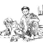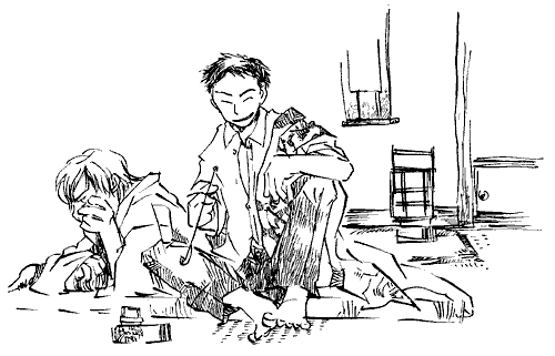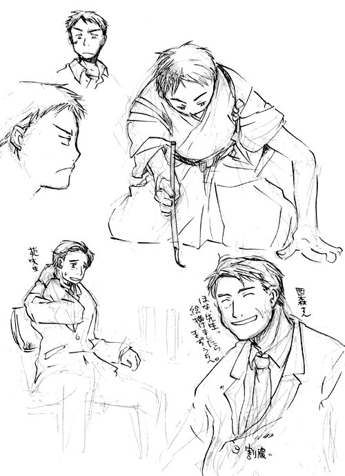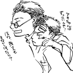 この絵を見せていただいた瞬間、「朧様が和装やったというのはアリ?」と、新しい世界に突然めざめた作者であります。時代背景的に、人々は和装洋装まぜこぜで暮らしていた時代だったので、怜司兄さんが和装だった時もあるかもしれません。……イイナ!(←脳内シミュレーション済み) 怜司兄さんもおとんも軍服だったりと洋装率のほうが高そうではありますが、部屋着は着物なこともあるやろなー。怜司兄さんとこになぜ、おとんの服が残っているかですが、自分のを脱いで、ツレのを着て帰ったからです。怜司兄さんには、ツレのものを貰う癖のほかに、そのうち出てきますが、ツレに服を貢ぐ癖もあります。新しいほうを着せたから、古い方のが残っているわけです。(って細かいYO!!) -