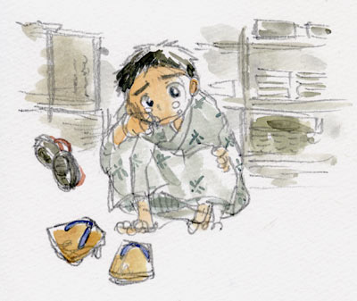 からんころんも絵に描いてもらえました! 和装の履き物は、靴のように細かいサイズがないので、壊れない限り、親子代々何人でも履けます。からんころんも製造年月日が不明ですが、もしかするとハンパ無く古い履き物なのかもしれません。長く使われた道具類に魂が宿るという、つくも神です。子供用の下駄なので、代々、秋津家の子供達が履いてきたもので、子供を守ってくれる神さんやろうと思います。アキちゃんの両親も、子供のころには履いてたんじゃないかな。アキちゃんが育ってしまって、後に続く子供がいないので、平成のからんころんは蔵に仕舞われたままです。 -