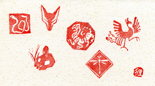 これもハンコです。サムネイルにはトンボさんだけですが、全部で六個のハンコが捺されています。上段、左から、「蛇」「狐」「虎」「不死鳥」「髑髏に雀」「蜻蛉」です。わー、すごい!(手先が不器用なので感動してひたすらスゴイを連発してしまう…) トンボさんはサイトのfaviconにしたいくらいです。 -