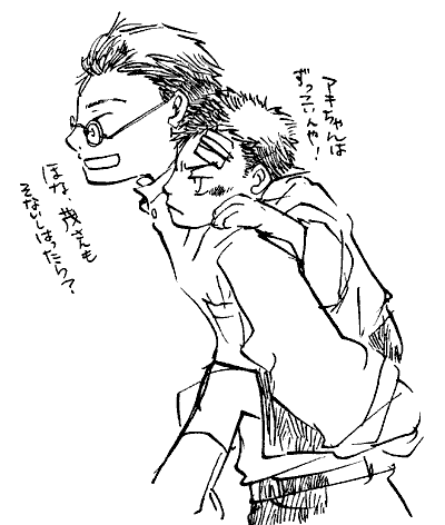 剣道少年なアキちゃんです。アキちゃんですが、これには萌えます! 道場で頑張っている時と、絵を描いている時のアキちゃんが作者は好きです。(それ以外の時は……?) アキちゃんは、おとんと違うて平成の子なんで、等身大でヤワやねん、と思って書いたんですが、平成の子をナメ過ぎだったでしょうか。平成の子の中でも、アキちゃんはヘタレなほうのような気がします。たぶん相当に、優しい性格の子なんだろうなあ。 -